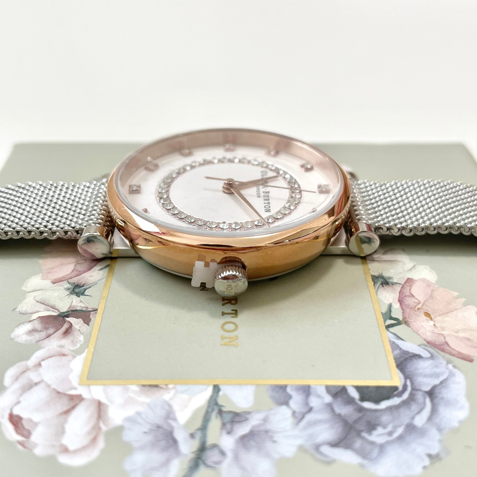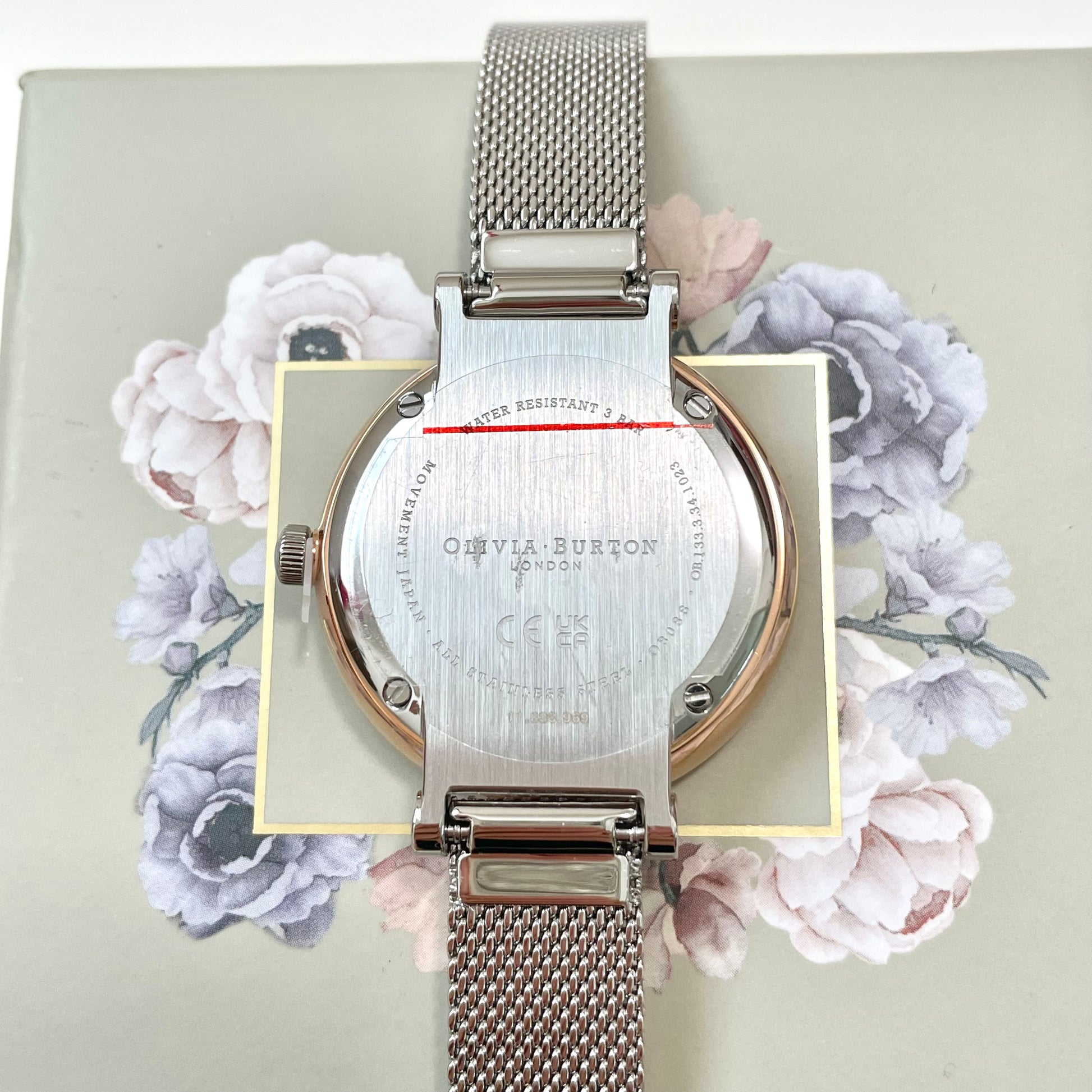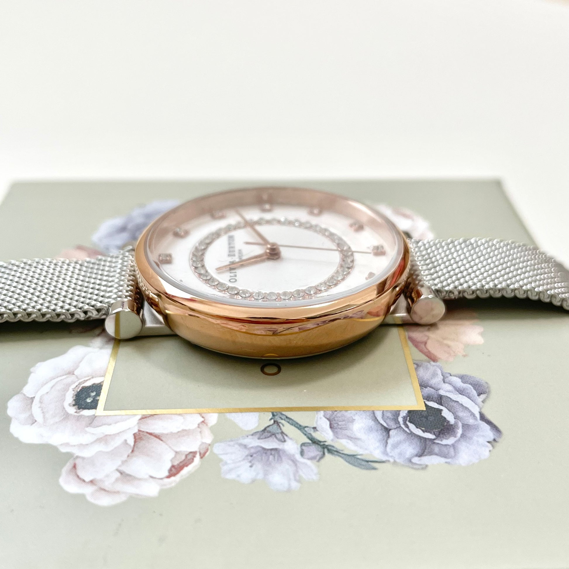 ローズゴールドトーンのケースにシルバーのメッシュストラップがセットされ、ラグジュアリーな雰囲気を醸し出しています。