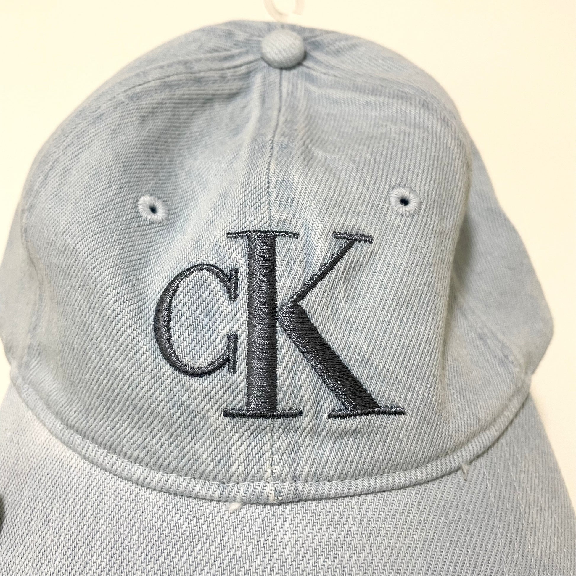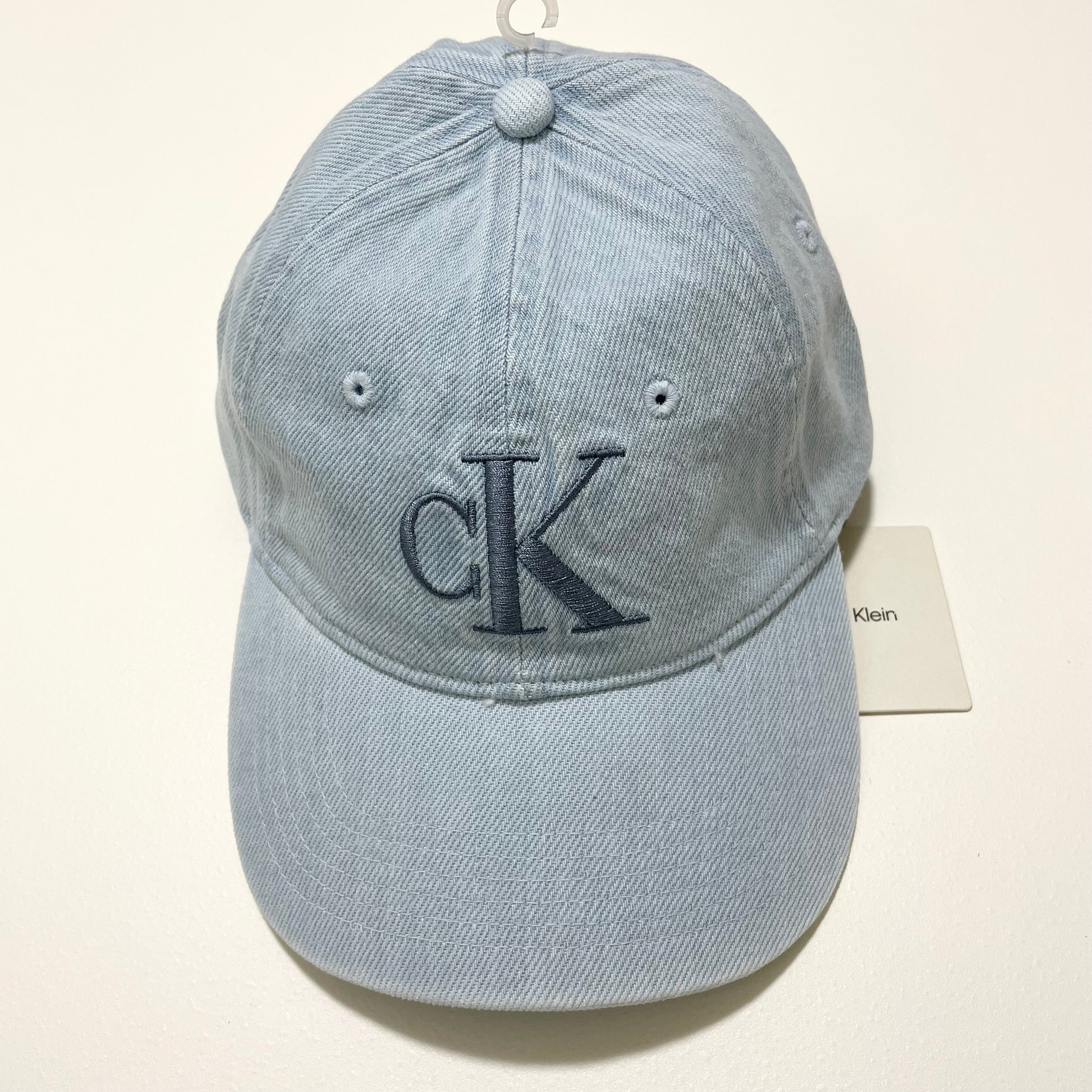 ライトブルーのデニム素材に、フロント中央へ大きく施された「CK」の刺繍ロゴが映える、シンプルでスタイリッシュなデザインです。