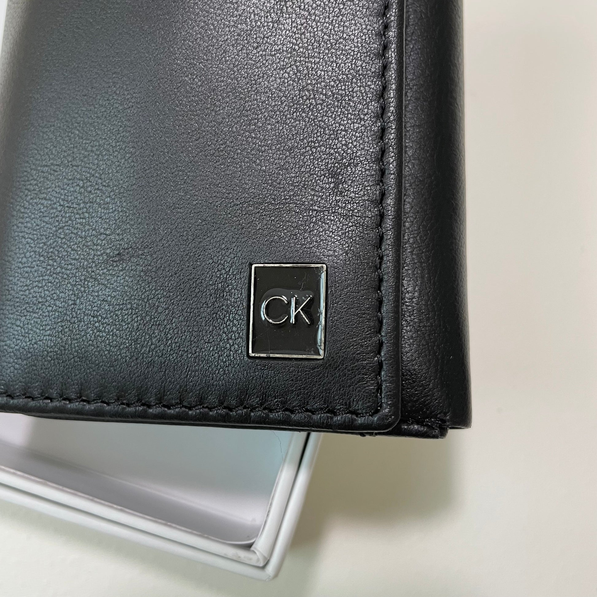 CKのブラックロゴプレートがワンポイントの財布。