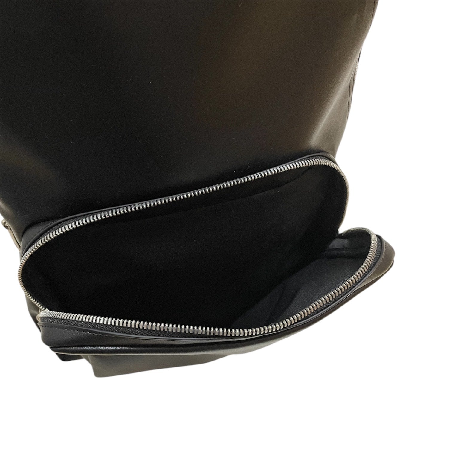 シンプルなブラックデザインで、フロントポケット部分にさりげなくあしらわれたブランドロゴがアクセントになっています。