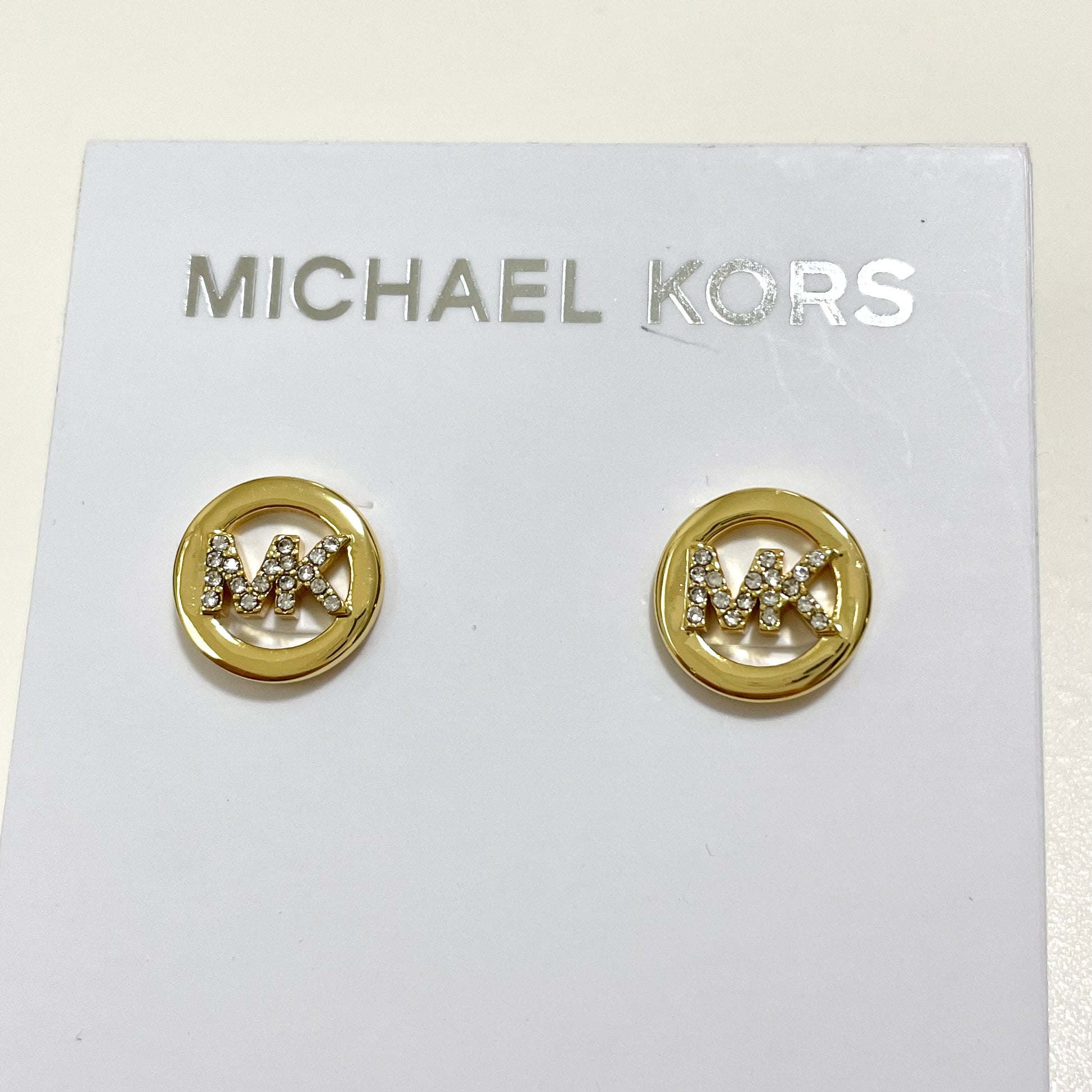 ゴールドのサークルフレームの中心に、キラキラと輝く「MK」ロゴがあしらわれた上品で華やかなデザインです。