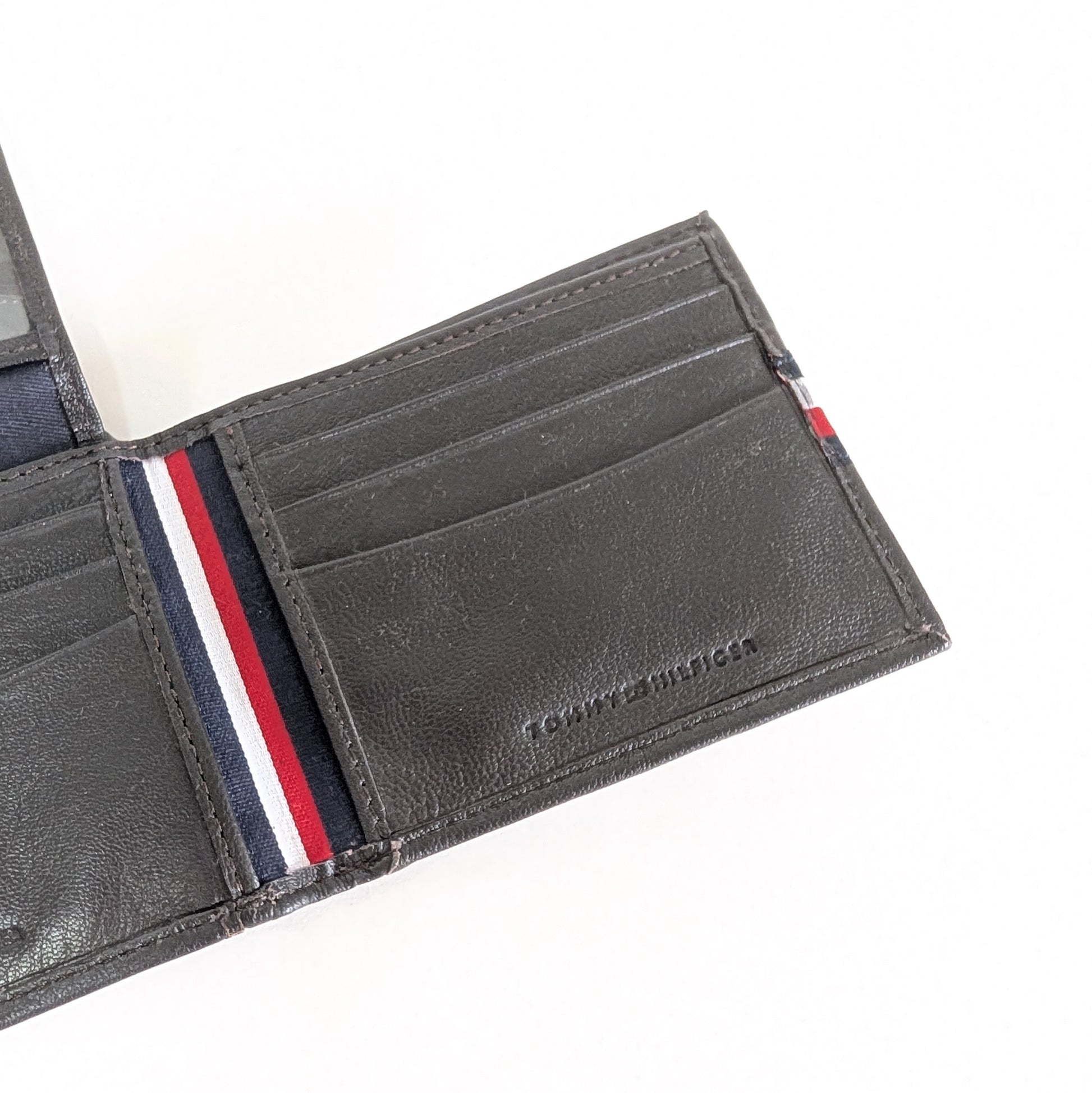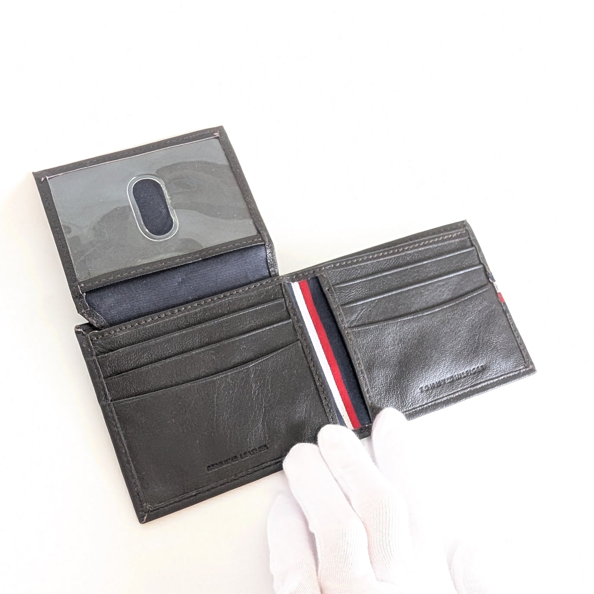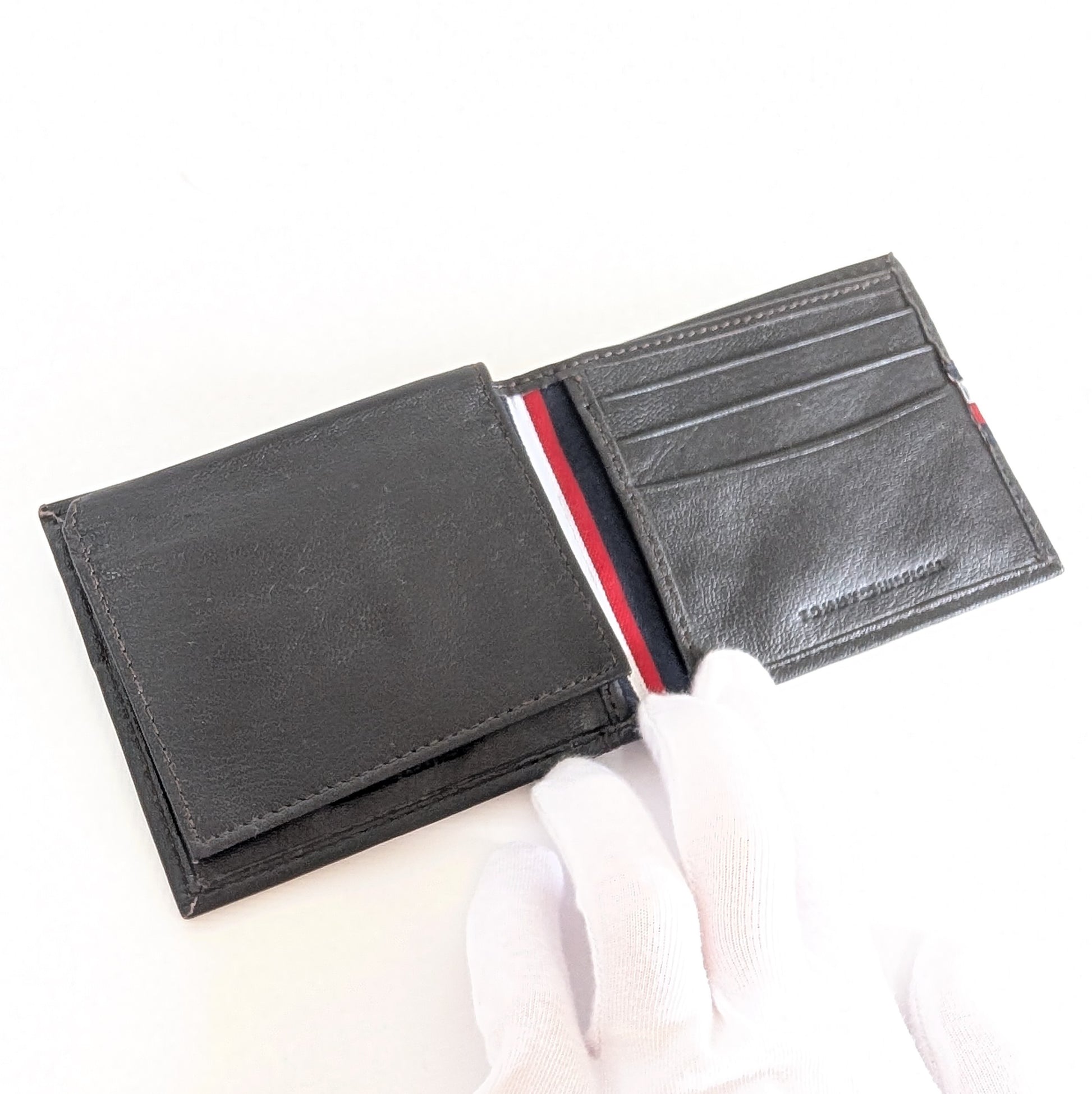 トミーヒルフィガーのブラックレザー折り財布は、センターを走るトリコロール柄が印象的。シンプルかつカッコいいデザインで若い世代から30代まで幅広く支持されています。